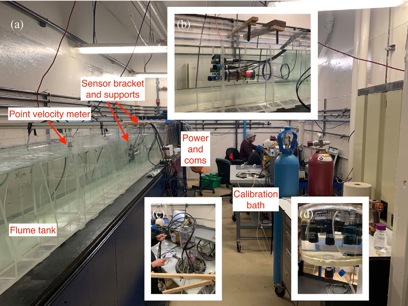 (b) 安裝於水槽中的多組光學氧氣感測器(optodes)支架。