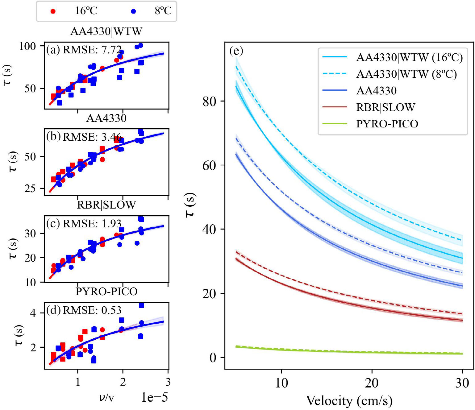 (a–d) 各類光學氧氣感測器(optode)在不同溫度下(紅色:16°C;藍色:8°C)之反應時間(τ),與黏滯係數(υ)與流速(v)之比值的關係。