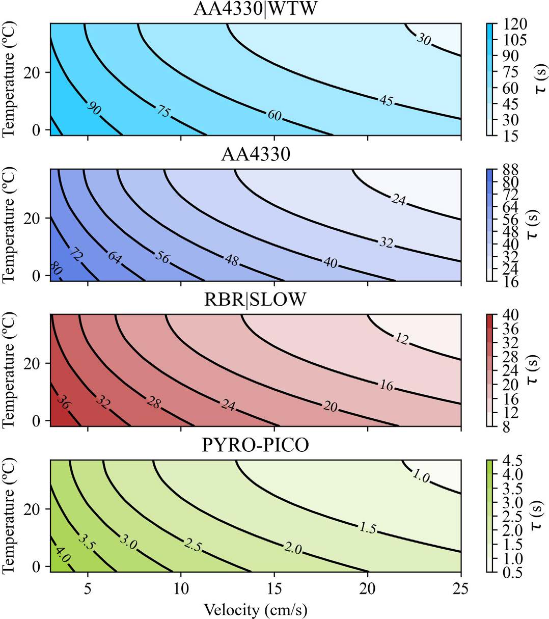 四種不同光學氧氣感測器(optode)的反應時間(τ),隨溫度與流速變化的關係: